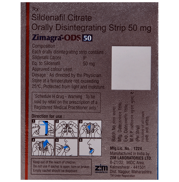 Take this medicine in the dose and duration as advised by your doctor. Do not handle the strips/film with wet hands. Keep it in your mouth but do not swallow it. Zimagra-ODS 50 Orally Disintegrating Strip may be taken with or without food, but it is better to take it at a fixed time.